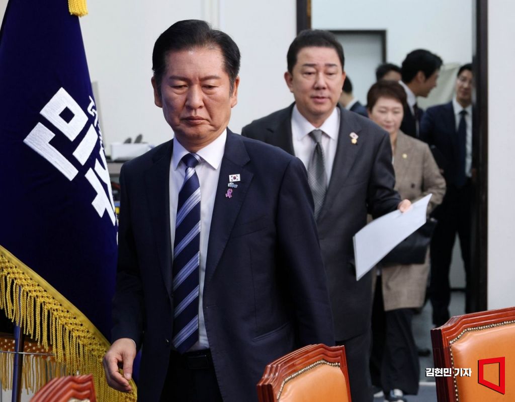 정청래 더불어민주당 대표가 17일 국회에서 열린 최고위원회의에 참석하고 있다.