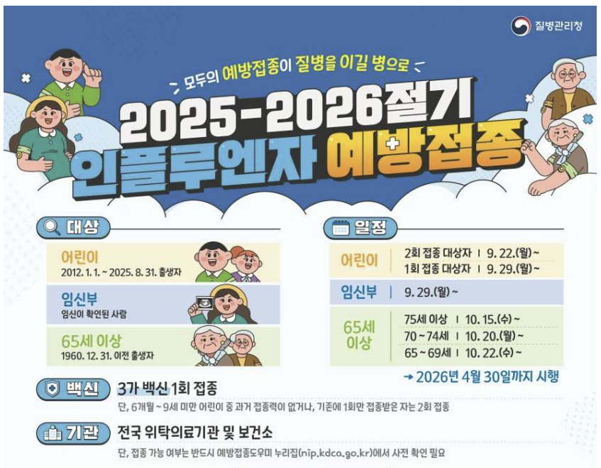 질병청은 독감 피해와 확산을 막기 위해 현재 고위험군인 어린이, 임산부, 만 65세 이상 어르신 등을 대상으로 무료 독감 예방접종 사업을 실시 중이다.