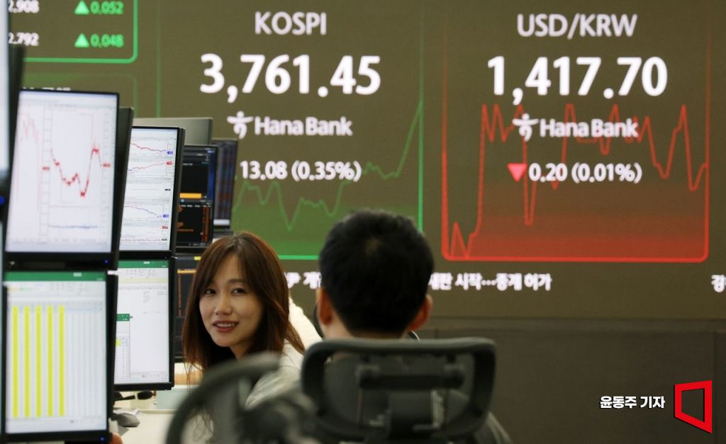 코스피 지수가 3,760을 넘어서며 사상 최고치를 다시 경신한 17일 서울 중구 하나은행 딜링룸 현황판에 지수가 표시되고 있다.