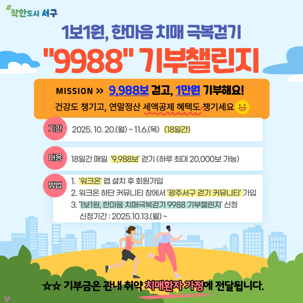 참가자는 '워크온(Walk On)' 앱을 활용해 하루 평균 9,988보를 달성할 경우 '1만원 기부권'을 받을 수 있으며 챌린지 종료 후 만족도 조사와 기부 동의 절차를 완료하면 기부권이 지역 취약계층 치매환자 가구에 전달된다.