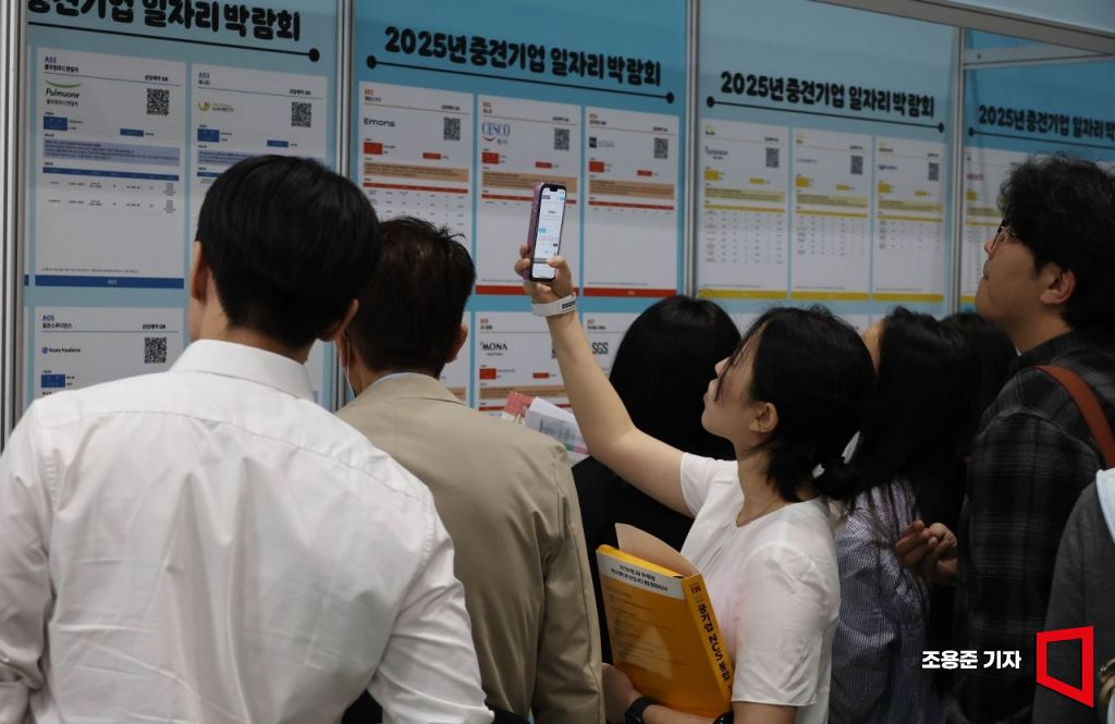 23일 서울 강남구 코엑스에서 열린 2025년 중견기업 일자리 박람회를 찾은 구직자들이 채용공고 게시판을 살펴보고 있다. 2025.4.23 조용준 기자