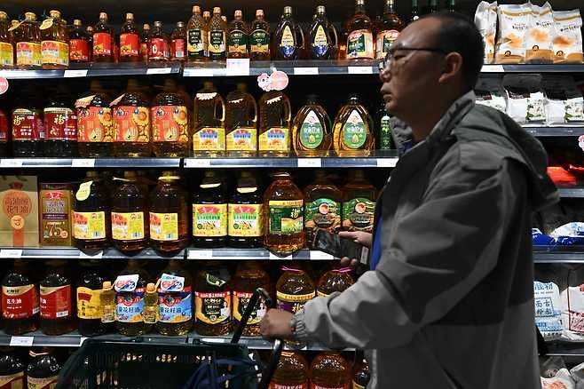 지난 15일(현지시간) 중국 베이징의 한 마트에서 쇼핑객이 식용유 진열대를 지나가고 있다. AFP연합뉴스