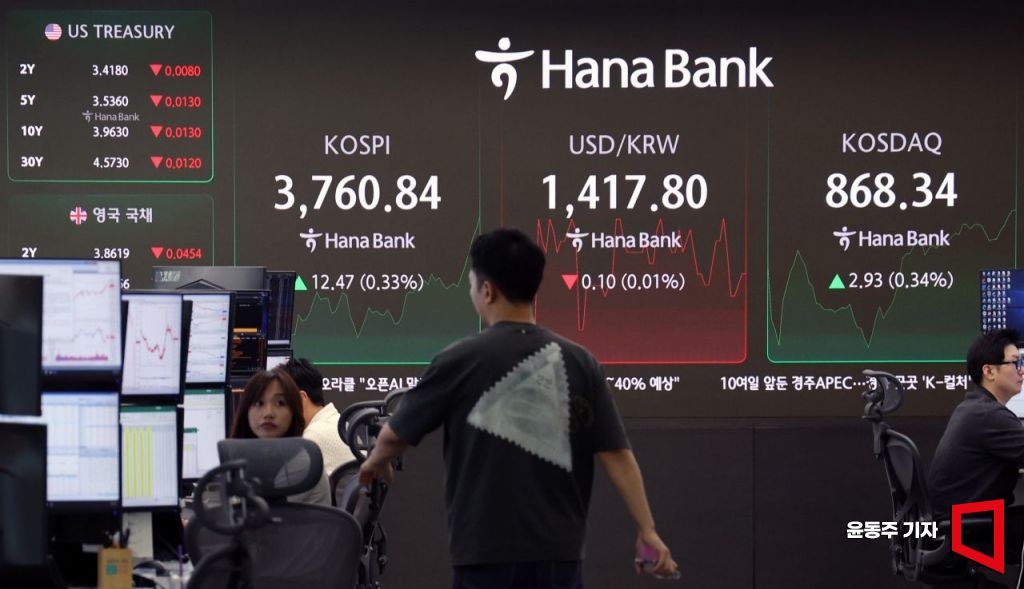 코스피가 0.52p(0.01%) 오른 3748.89에 장을 종료한 17일 서울 명동 하나은행 본점 딜링룸에서 딜러들이 업무를 보고 있다. 연합뉴스