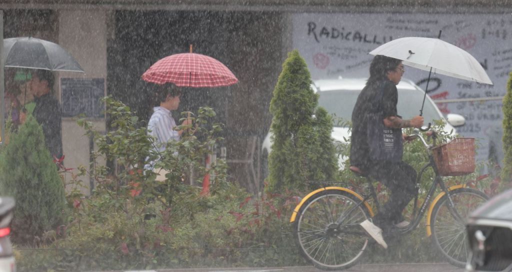 서울광장 주변에서 우산을 쓴 시민들이 발걸음을 옮기고 있다. 연합뉴스