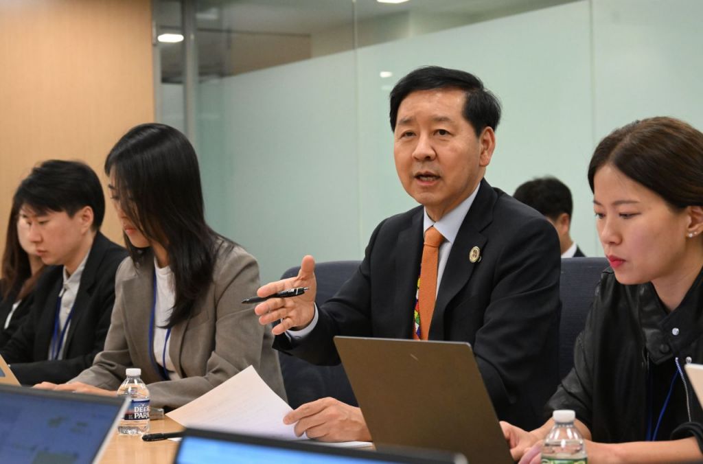 구윤철 부총리 겸 기획재정부 장관이 지난 16일(현지시간) 미국 워싱턴D.C. 국제통화기금(IMF) 본부에서 진행한 동행기자단과 간담회를 진행하고 있다.(기획재정부 제공)