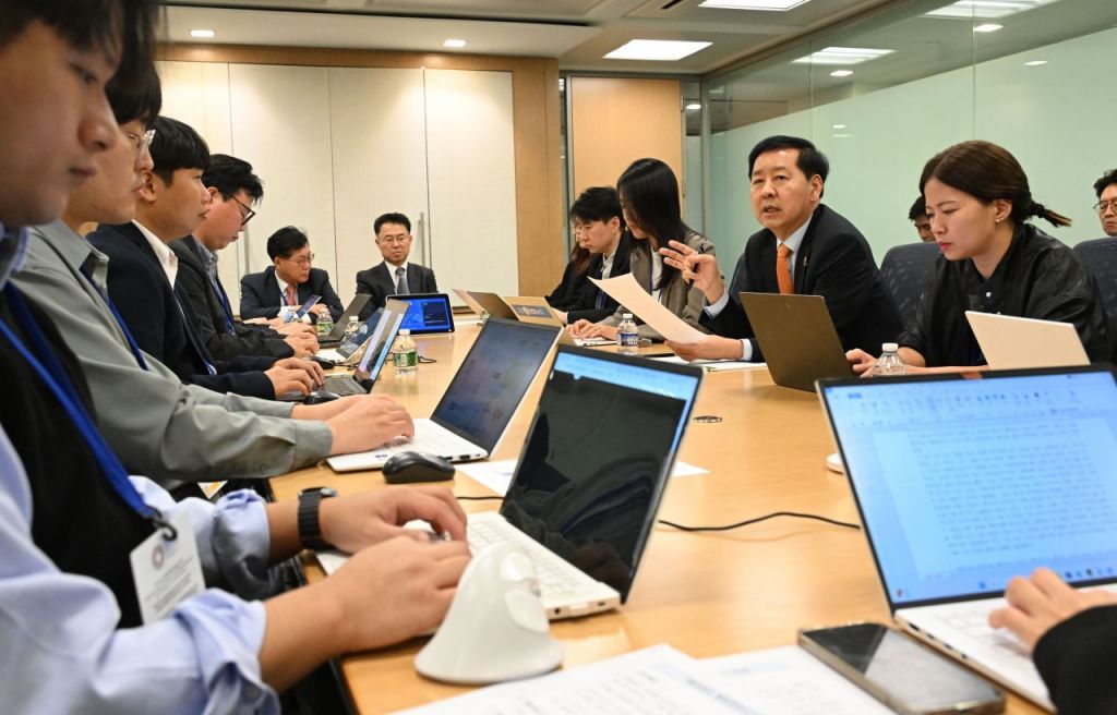 구윤철 부총리 겸 기획재정부 장관이 지난 16일(현지시간) 미국 워싱턴D.C. 국제통화기금(IMF) 본부에서 진행한 동행기자단과 간담회를 진행하고 있다.(기획재정부 제공)