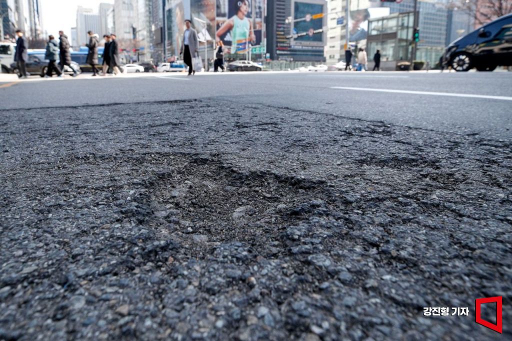 겨울철 지반 동결과 해빙 등으로 도로 파임(포트홀) 현상이 발생 중인 4일 서울 한 도로에 포트홀이 생겨나 있다. 사진=강진형 기자aymsdream@