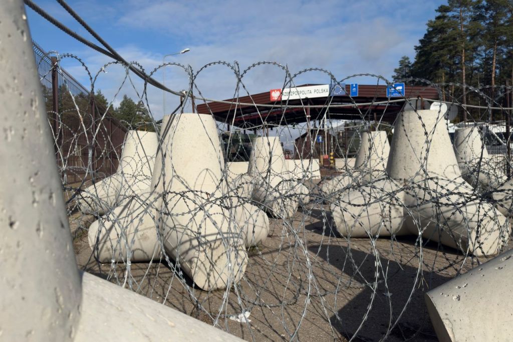 15일(현지시간) 폴란드 동부 벨라루스와의 접경지대에 설치된 대전차 방벽의 모습. AP연합뉴스