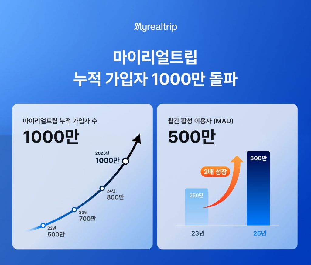 마이리얼트립은 2022년 누적 가입자 수 500만 명을 기록한 이후 3년 만에 1000만 명을 넘어섰고 동시에 월간 활성 이용자(MAU) 500만 명을 달성했다. 특히 최근 2년간 월 거래액이 꾸준히 증가해 항공 부문은 약 80%, 투어·액티비티와 숙박 부문은 각각 100%, 200% 이상 성장하며 주요 카테고리 전반에서 뚜렷한 상승세를 보였다. 또 지난해 흑자 전환에 성공한 데 이어 올해 7월 월간 거래액 2171억원, 1월부터 8월까지 누적 거래액 1조5000억 원을 달성했다.