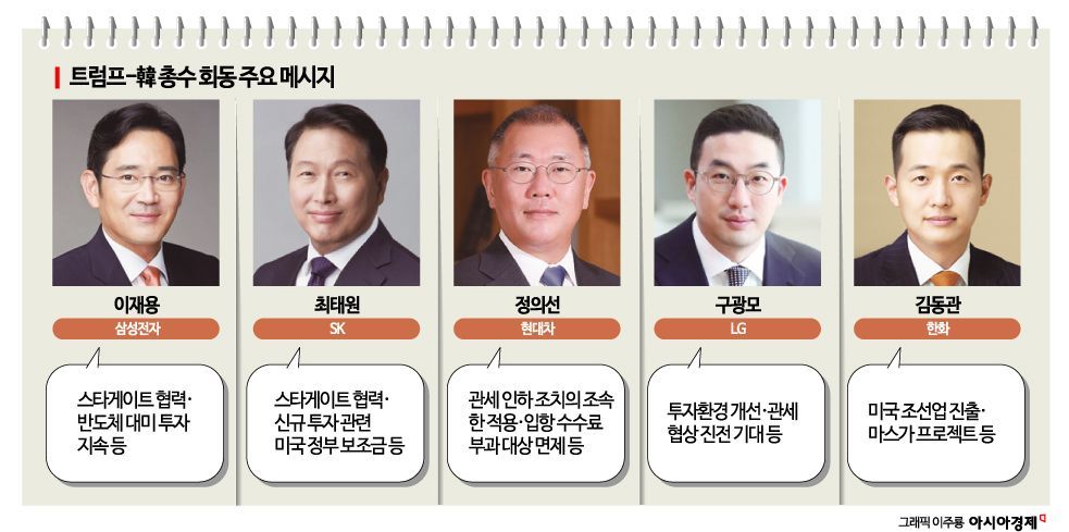 20일 재계에 따르면 이재용 삼성전자 회장, 최태원 SK그룹 회장, 정의선 현대자동차그룹 회장, 구광모 LG그룹 회장, 김동관 한화그룹 부회장 등 재계 총수들은 지난 18일(현지시간) 미국 플로리다에서 열린 골프 회동에서 트럼프 대통령과 만난 것으로 알려졌다.