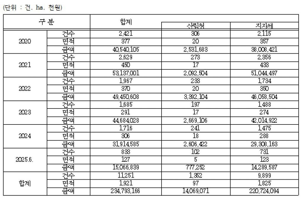 이 같은 사실은 지난해 10월 뒤늦게 국민신문고 접수를 통해 밝혀졌다. 하지만 공소시효 경과로 올해 3월 수사가 종결(공소권 없음)됐다. 산림청과 지방자치단체의 뒤늦은 단속으로 공소시효를 넘기면서 수사 자체가 이뤄지지 않은 셈이다.