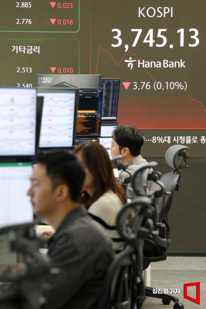 코스피 지수가 전 거래일 대비 26.51포인트 상승한 3775.40에 개장한 20일 서울 중구 하나은행 딜링룸에서 딜러들이 업무를 보고 있다. 2025.10.20 강진형 기자