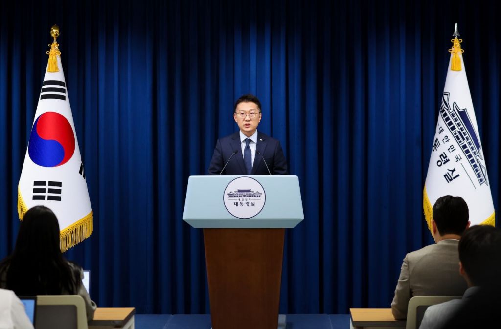 김남준 대변인이 20일 용산 대통령실에서 이날 진행된 이재명 대통령의 서울 ADEX 2025 개막식 및 방위산업 발전 토론회 참석 일정 관련 브리핑을 하고 있다. 연합뉴스