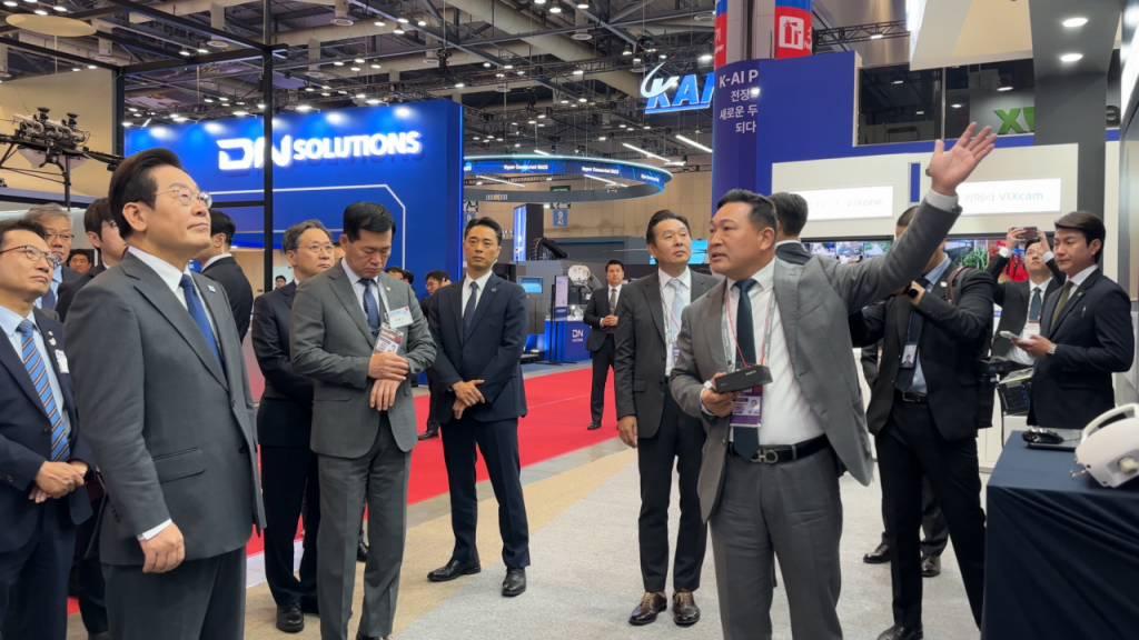 영상분석 인공지능(AI) 전문기업 인텔리빅스가 국방 감시·관제 AI 기술을 선보이는 전시 부스에 이재명 대통령이 방문했다.