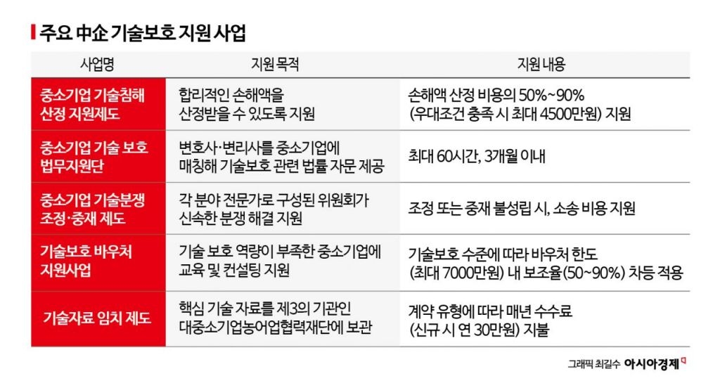 중소기업 기술침해 손해액 산정 지원제도는 중기부가 총괄하고 기술보증기금과 대중소농어업협력재단이 운영하는 사업으로, 기술 가치를 제대로 입증하지 못해 손해액을 충분히 받지 못하는 중소기업을 위해 정부가 전문기관을 통해 기술 가치 측정을 지원하고 손해액을 산정해주는 제도다. 2023년 처음 시범 운영된 이후 지난해부터 정식 운영되고 있다.