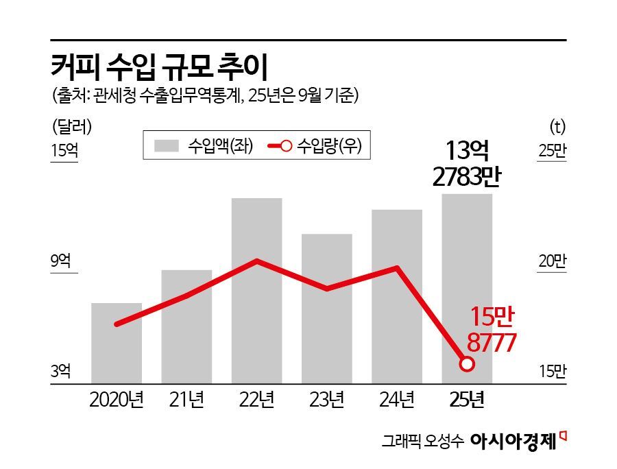 22일 관세청 수출입무역통계에 따르면 올해 3분기까지 국내 커피 원두 수입액은 13억2783만달러(약 1조9000억원)로 지난해 같은 기간(9억681만달러)보다 46.4% 증가한 것으로 집계됐다. 올해 마지막 1개 분기가 남은 가운데 지난해 수입액 12억4304만달러(약 1조7700억원)를 이미 넘어선 것으로, 남은 3개월 수입액이 더해진다면 올해 전체 수입액은 2조원을 크게 웃돌 전망이다.