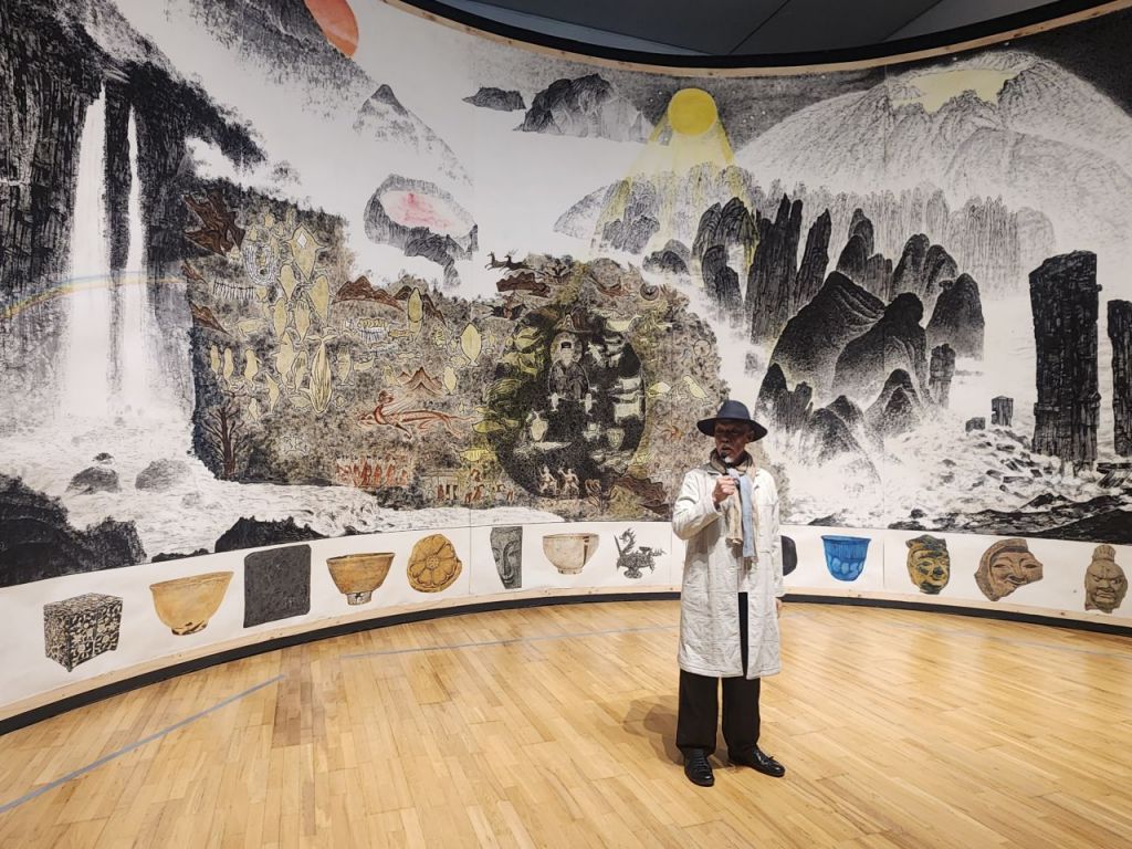 21일 박대성 화백이 솔거미술관에 전시된 자신의 작품 '코리아판타지'(2023) 앞에서 설명하고 있다. 서믿음 기자