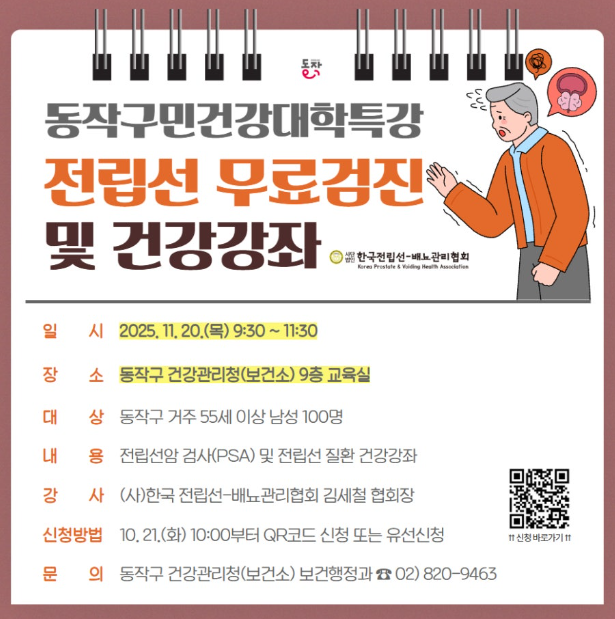 이번 특강은 ‘(사)한국 전립선-배뇨관리협회’와 협력해 전립선질환 예방 및 조기관리를 위한 무료 건강강좌와 검진으로 마련됐다. 다음 달 20일 오전 9시 20분부터 11시 30분까지 동작구 건강관리청 9층 교육실에서 관내 55세 이상 남성 100명을 대상으로 진행된다.