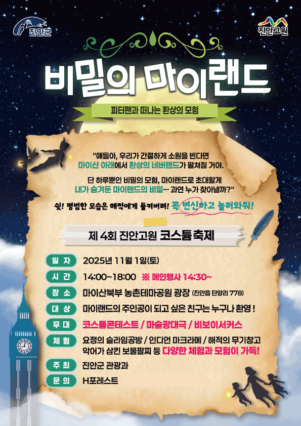 군 관계자는 "이번 축제는 마이산을 배경으로 펼쳐지는 특별한 코스튬 행사로, 전주·대전 등 인근 시군에서도 해마다 더 많은 분들이 찾아오고 있다"며 "주민과 관광객이 함께 어울려 즐기는 진안만의 신선하고 유쾌한 관광 축제인 만큼, 비밀의 마이랜드에서 특별한 가을날의 추억을 만들어 가시길 바란다"고 말했다.