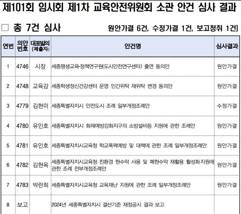 세종시의회 교육안전위원회는 22일 제1차 회의를 열고, 조례안 5건과 동의안 2건을 심사하고, 보고 1건을 청취했다. 심사 결과 세종특별자치시교육청 학교폭력 예방 및 대책에 관한 조례 일부개정 조례안, 세종특별자치시 안전 도시 조례 일부개정 조례안 등 조례안 5건과 세종 학생 정신건강센터 운영 민간위탁 재위탁 변경 동의안은 원안 가결됐고, 세종 평생교육·정책연구원(도시 안전연구센터) 출연 동의안은 수정 가결됐다. 지난해 세종특별자치시 결산기준 재정공시 결과 보고도 청취했다.