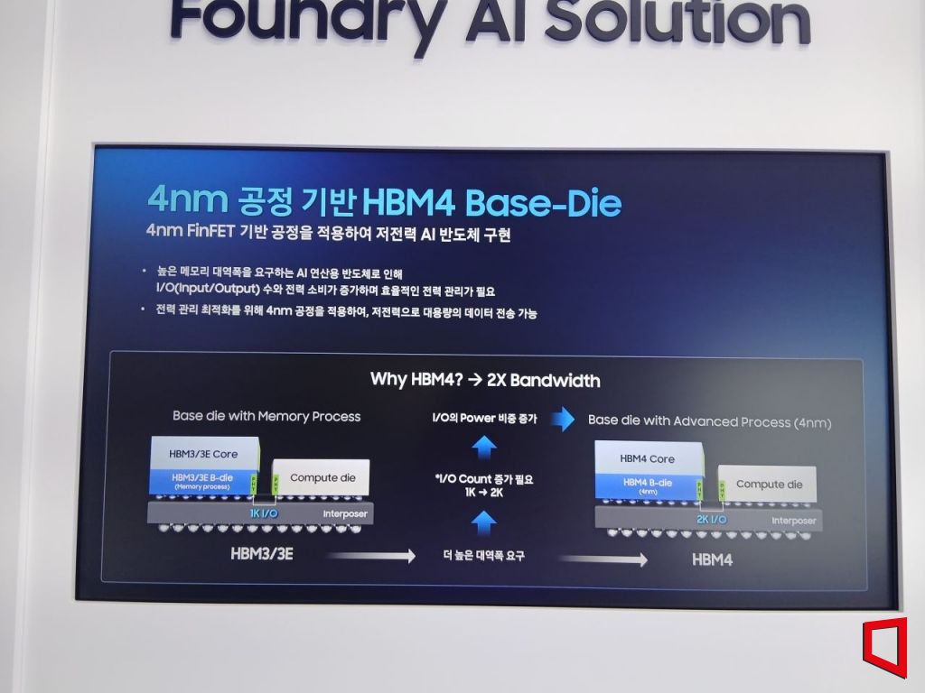 이번 전시에서 6세대 고대역폭메모리(HBM4) 12단 제품의 실물을 처음으로 우리나라 대중 앞에서 공개하면서 HBM4의 베이스 다이를 자사 파운드리의 4나노 공정으로 만든다는 점도 홍보해 눈길을 끌었다. 베이스 다이는 HBM의 맨 아래에서 메모리 동작 제어와 데이터 분배를 담당하는 일종의 '받침'이다. HBM4부터는 베이스 다이도 AI 연산의 효율을 높이고 에너지를 관리하는 등 그 기능이 더욱 적극적으로 변모하며 기업들도 베이스 다이 생산 공정을 선택하는 데 있어 신중을 기하고 있다. 삼성은 자사의 4나노 기반 파운드리를 통해 베이스 다이로 만들기로 하며, 대만 TSMC에 베이스 다이 생산을 맡기는 타사들과는 차별성을 두려 하고 있다. 이번 전시에서도 삼성은 이를 부각하고자 HBM4 전시와는 별도로 내용을 설명하는 영상을 설치했다.