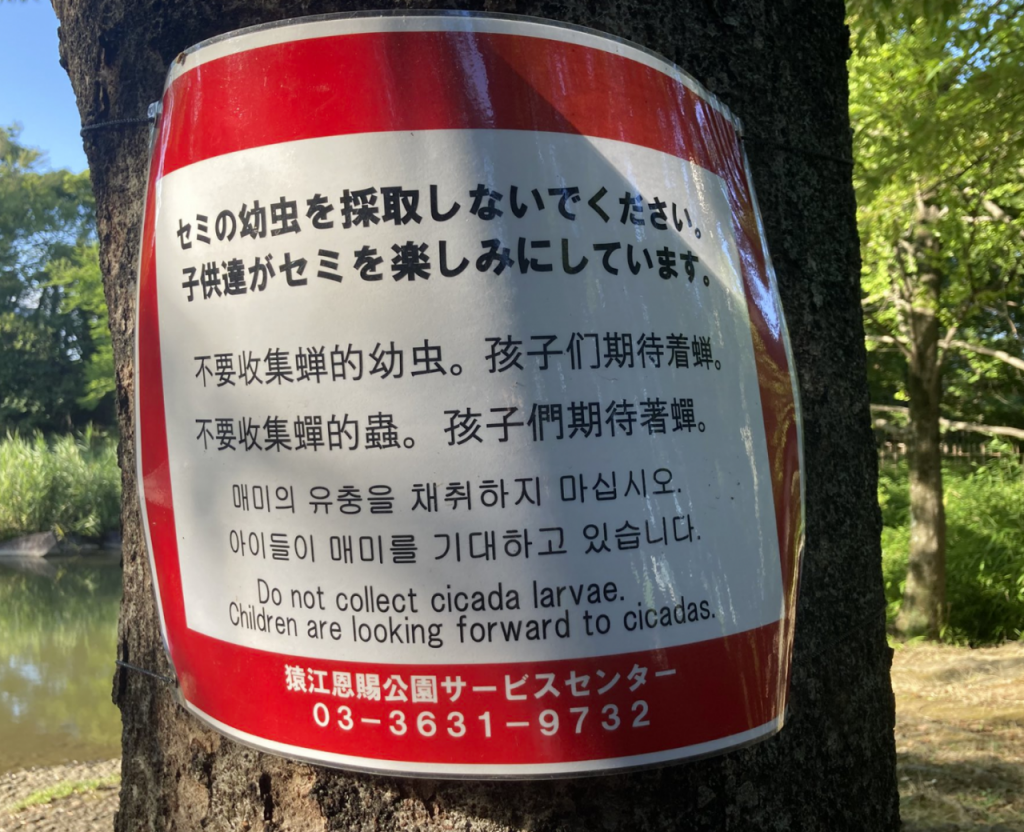 일본 도쿄의 한 공원에 매미 채집을 금지하는 안내가 걸려있다. 엑스