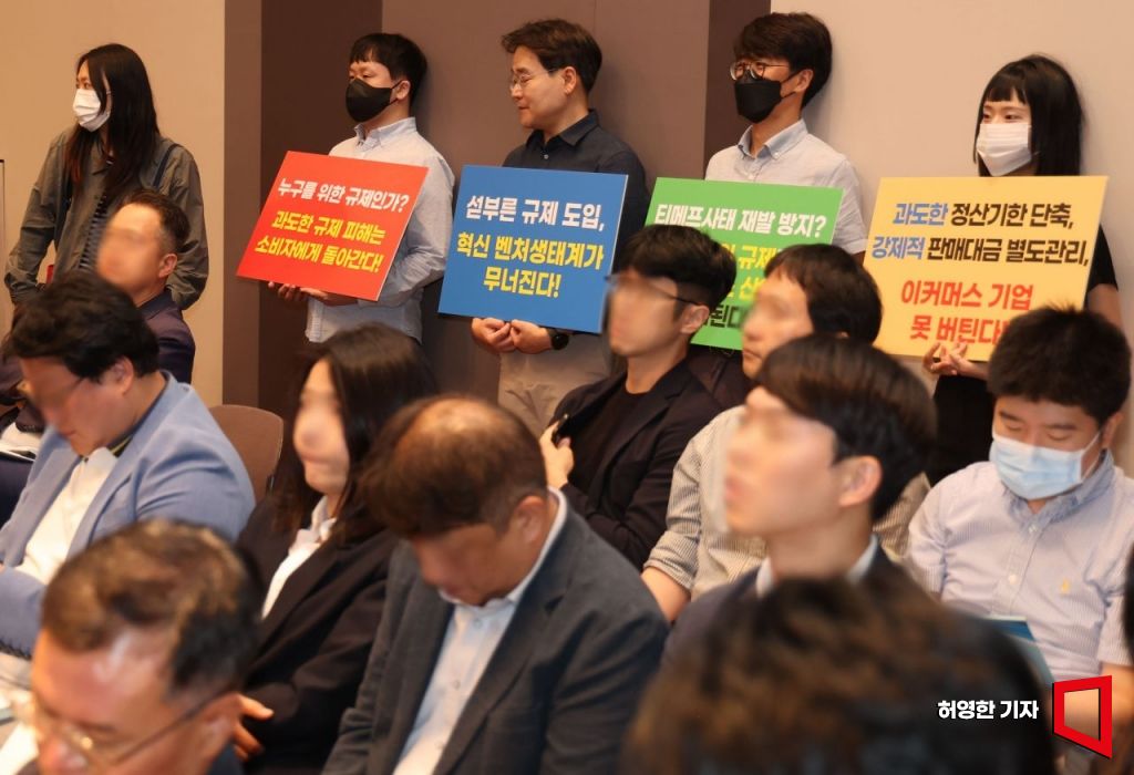 지난해 티몬·위메프 사태 재발 방지를 위한 대규모유통업법·전자금융거래법 개정(안) 공청회에서 일부 참석자들이 e커머스에 대한 과도한 규제를 반대하는 피켓을 들고 서 있다. 허영한 기자