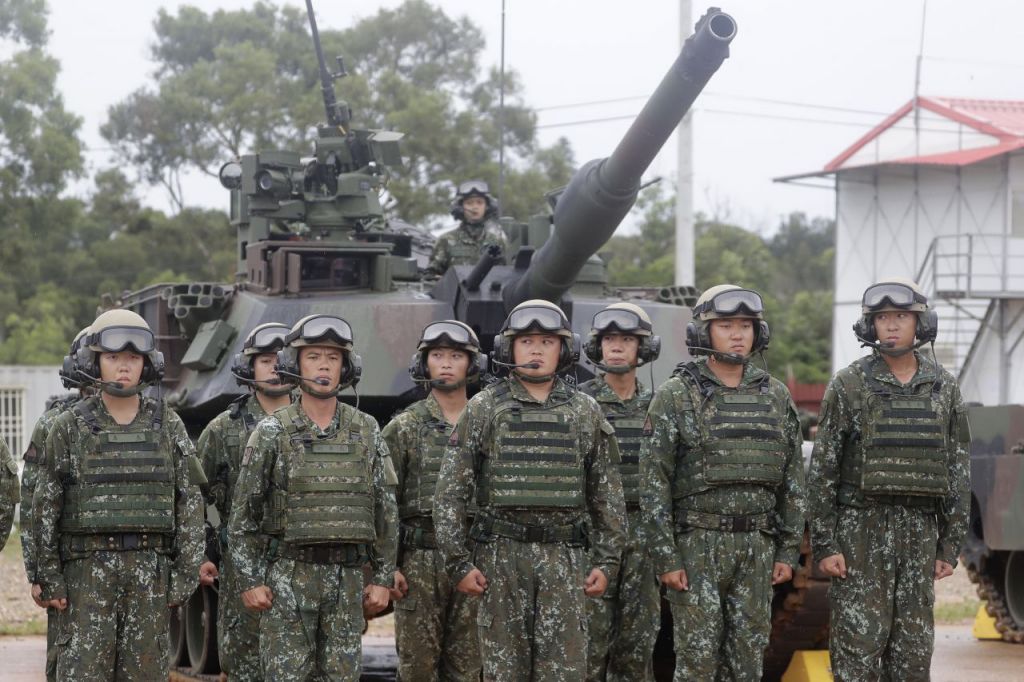 지난 7월 대만 신주현에서 열린 군 실사격 훈련에서 군인들이 전차 앞에 서 있다. AP연합뉴스