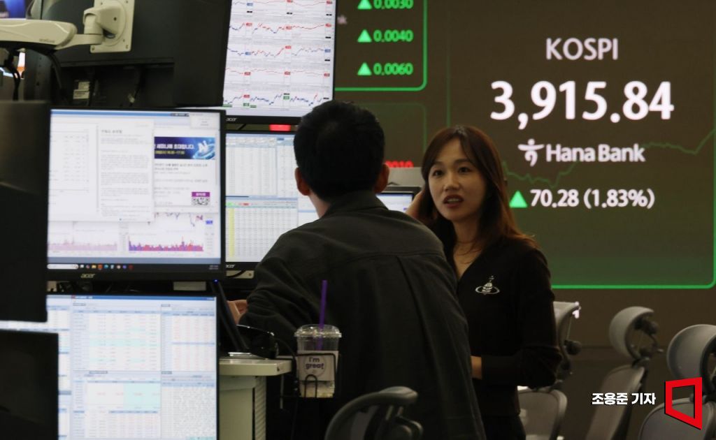 코스피 지수가 장중 사상 최고치를 경신한 24일 서울 중구 하나은행 딜링룸 현황판에 코스피, 원/달러 환율 등이 표시돼 있다. 코스피는 이날 오전 9시 2분 기준 전 거래일 대비 54.74포인트(1.42%) 오른 3900.3에 원/달러 환율은 2.9원 내린 1,436.7원에 개장했다.