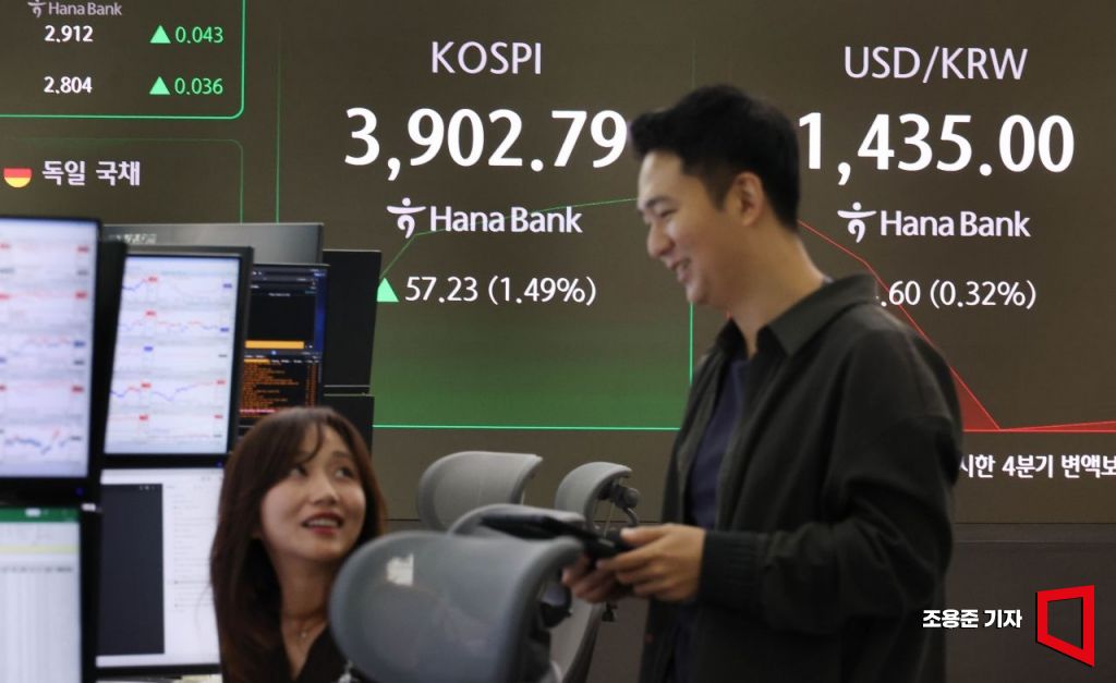 코스피 지수가 장중 사상 최고치를 경신한 24일 서울 중구 하나은행 딜링룸 현황판에 코스피, 원/달러 환율 등이 표시돼 있다. 코스피는 이날 오전 9시 2분 기준 전 거래일 대비 54.74포인트(1.42%) 오른 3900.3에 원/달러 환율은 2.9원 내린 1,436.7원에 개장했다.