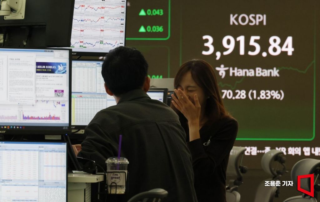 코스피 지수가 장중 사상 최고치를 경신한 24일 서울 중구 하나은행 딜링룸 현황판에 코스피, 원/달러 환율 등이 표시돼 있다. 코스피는 이날 오전 9시 2분 기준 전 거래일 대비 54.74포인트(1.42%) 오른 3900.3에 원/달러 환율은 2.9원 내린 1,436.7원에 개장했다.