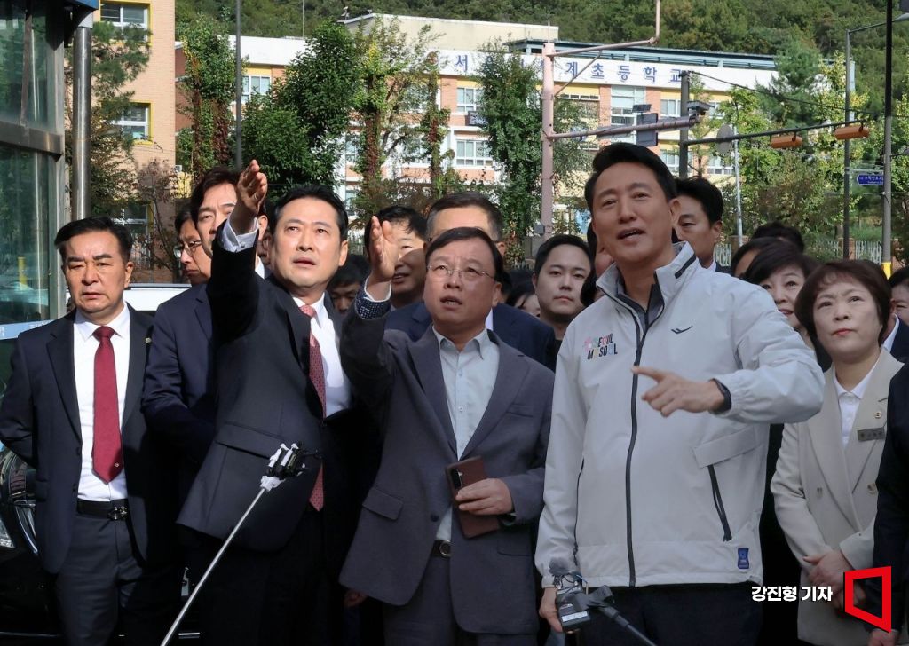 오세훈 서울시장, 국민의힘 장동혁 당대표, 송언석 원내대표 등이 24일 오전 서울 노원구 상계5 재정비촉진구역에서 열린 국민의힘-서울특별시 부동산 대책 현장 회의에서 현장점검을 하고 있다.