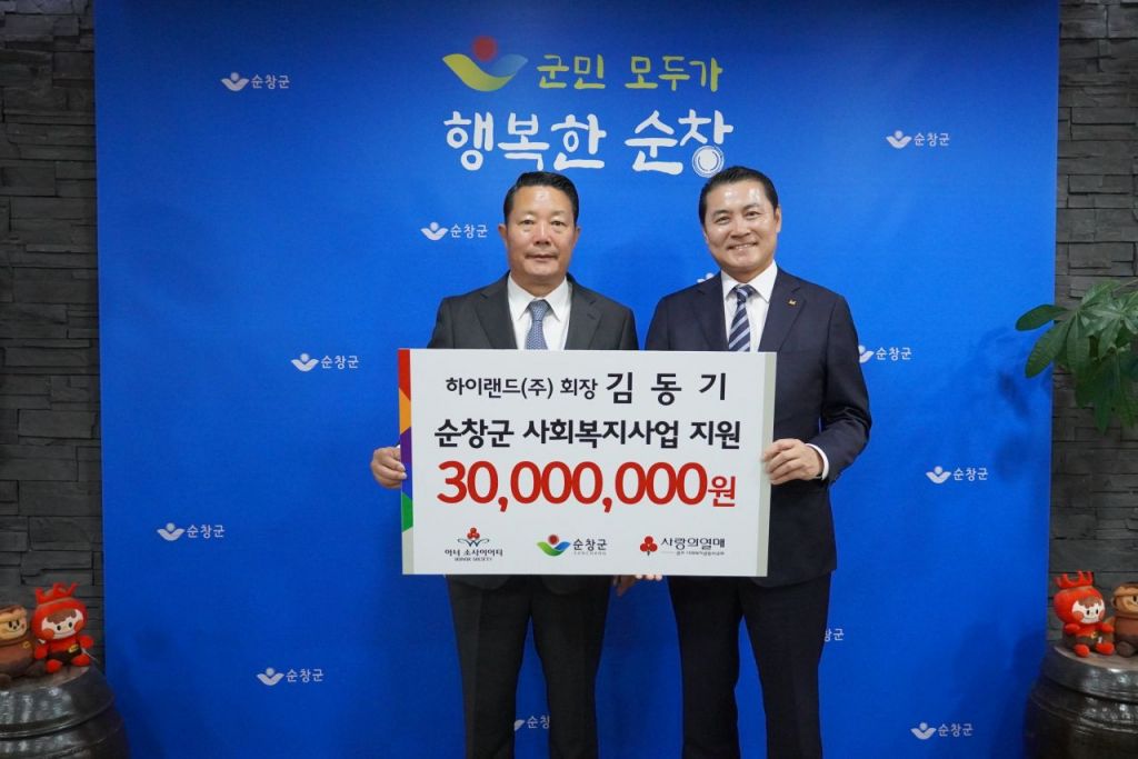 하이랜드㈜ 김동기 회장이 순창군 사회복지사업 지원을 위한 기부금 3,000만원을 전달했다. 광주사회복지공동모금회 제공
