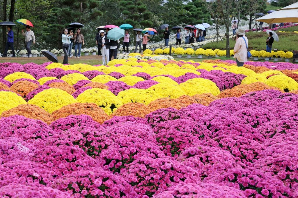 가을비가 내린 지난 18일 전북 임실군 옥정호 붕어섬에서 관광객들이 만개한 국화를 보며 가을을 즐기고 있다. 연합뉴스