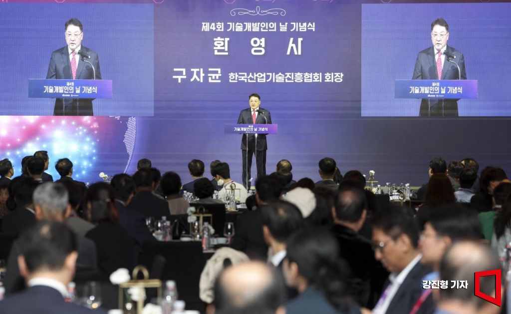 구자균 한국산업기술진흥협회 회장이 24일 서울 여의도 페어몬트 앰배서더호텔에서 열린 '제4회 기술개발인의 날 기념식'에 참석해 환영사 하고 있다.