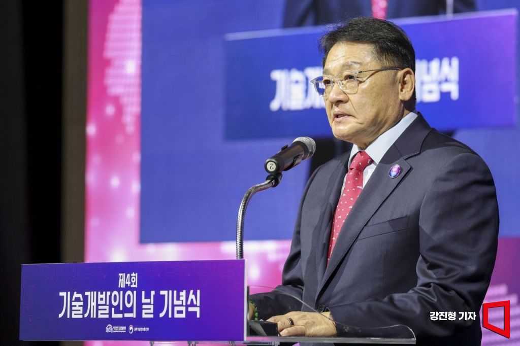 구자균 한국산업기술진흥협회 회장이 24일 서울 여의도 페어몬트 앰배서더호텔에서 열린 '제4회 기술개발인의 날 기념식'에 참석해 환영사 하고 있다.