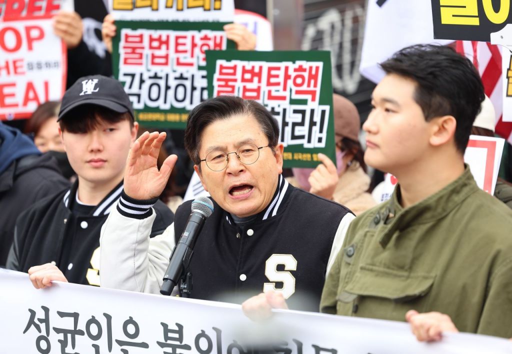 황교안 전 국무총리가 28일 서울 종로구 성균관대학교 앞에서 열린 윤석열 대통령 탄핵 반대 집회에 참가해 규탄 발언을 하고 있다. 연합뉴스