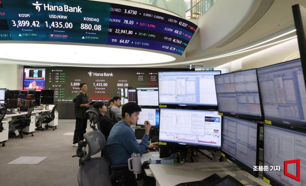 코스피 지수가 장중 사상 최고치를 경신한 지난 24일 서울 중구 하나은행 딜링룸 현황판에 코스피,