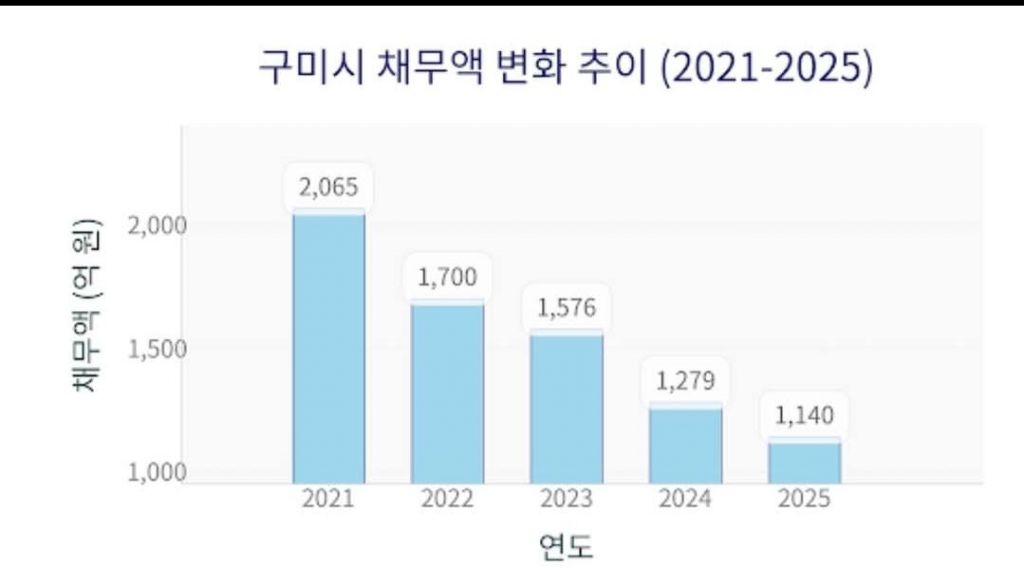 실제 구미시의 채무는 ▲2021년 2065억원 ▲2022년 1700억원 ▲2023년 1576억원 ▲2024년 1279억원 ▲2025년 현재 1140억원으로 4년간 925억원이 줄었다.