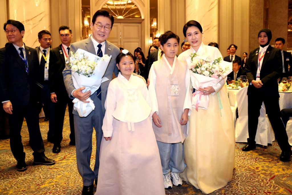 이재명 대통령과 김혜경 여사가 26일 말레이시아 쿠알라룸푸르 한 호텔에서 열린 동포 만찬 간담회에서 화동과 기념촬영을 하고 있다. 연합뉴스