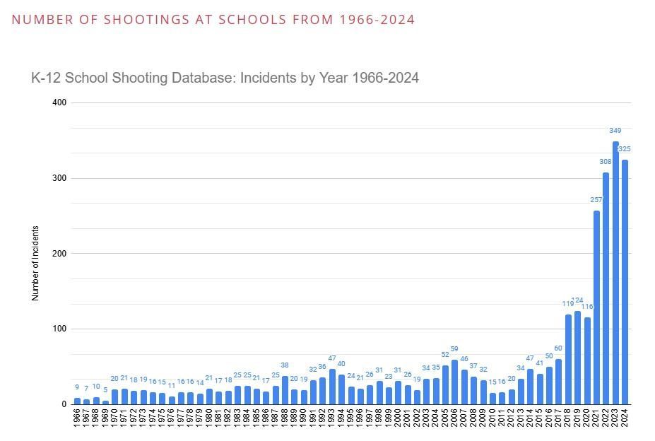 미국 전역의 유치원·초·중·고교에서 일과시간 중에 총기가 발사되거나 휘둘러진 사례를 수집하는 'K-12 학교 총격 데이터베이스'의 1966년 이후 연도별 총격사건 발생 건수. K-12 학교 총격 데이터베이스