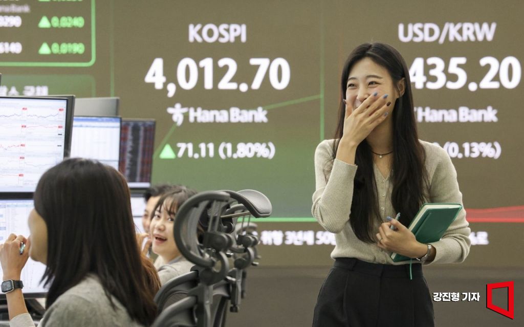 국내 대표 주가지수인 코스피가 사상 처음으로 4000선을 돌파한 27일 서울 중구 하나은행 본점 딜링룸에서 딜러들이 업무를 보고 있다.