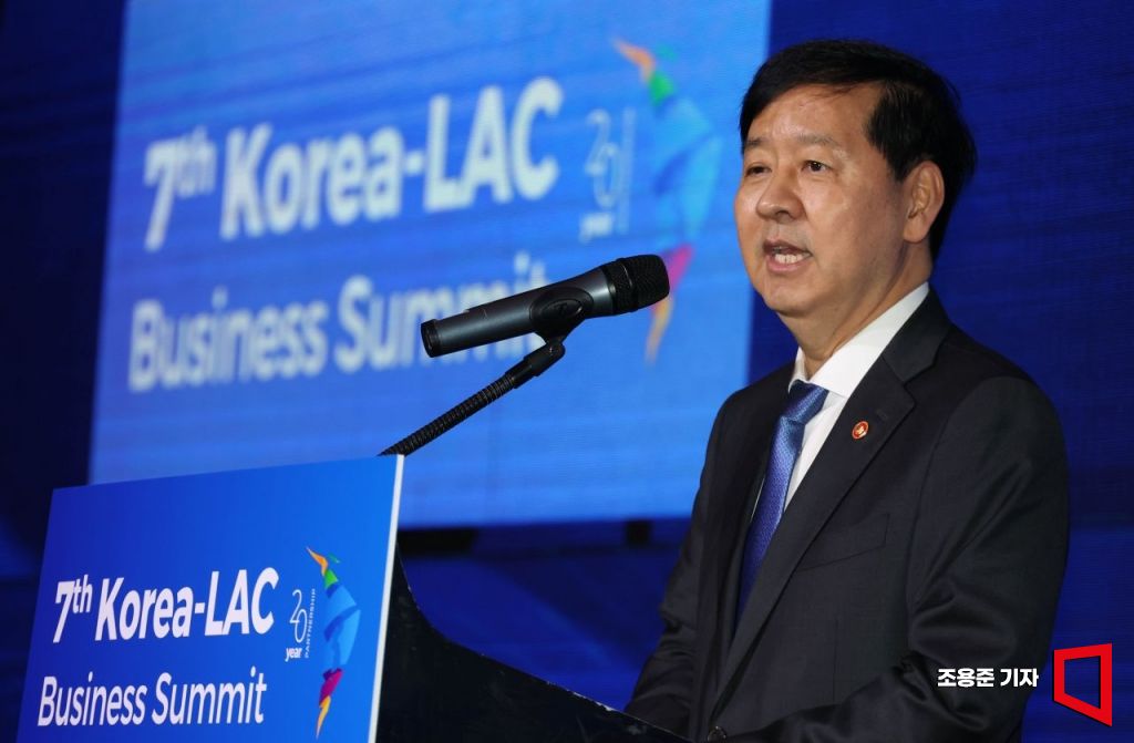 구윤철 경제부총리 겸 기획재정부 장관이 27일 서울 여의도 콘래드호텔에서 열린 한-중남미 비즈니스 서밋에 참석, 개회사를 하고 있다.