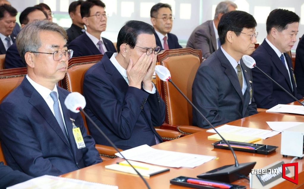 노동진 수산업협동조합중앙회이 27일 서울 여의도 국회에서 열린 농림축산식품해양수산위원회의 수협중앙회 등에 대한 국정감사에서 출석해 얼굴을 만지고 있다.