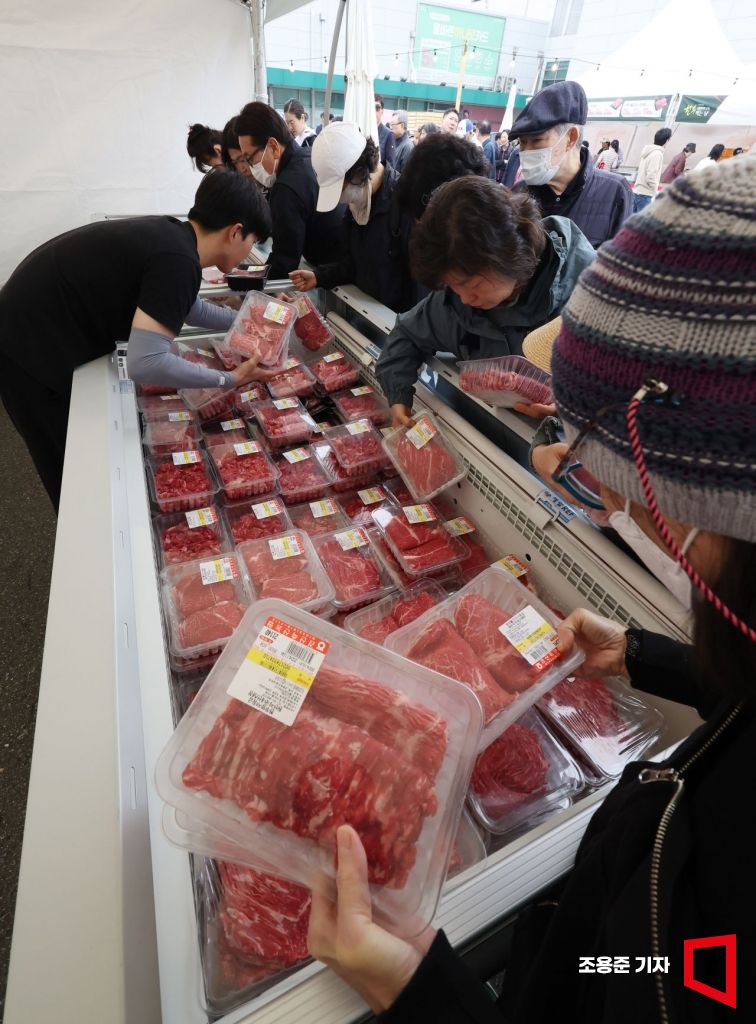 지난해 한우먹는날 행사가 열린 서울 하나로마트 양재점 특별행사장을 찾은 소비자들이 한우를 고르고 있다. 조용준 기자