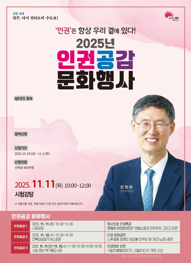 '인권은 항상 우리 곁에 있다'를 주제로 한 이번 행사는 전주시청 강당과 전북대상점가 버스킹존, 시청 로비 책기둥도서관 등에서 진행되며, ▲인권 특강 ▲문화공연 ▲인권영화 상영 ▲홍보부스 운영 등 시민이 일상에서 인권의 가치를 체감할 수 있는 다양한 프로그램으로 구성된다.