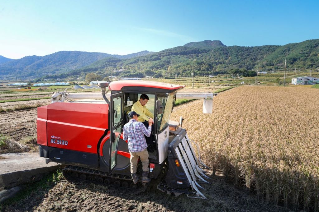 이상근 고성군수가 친환경 벼 재배단지 수확현장 방문.