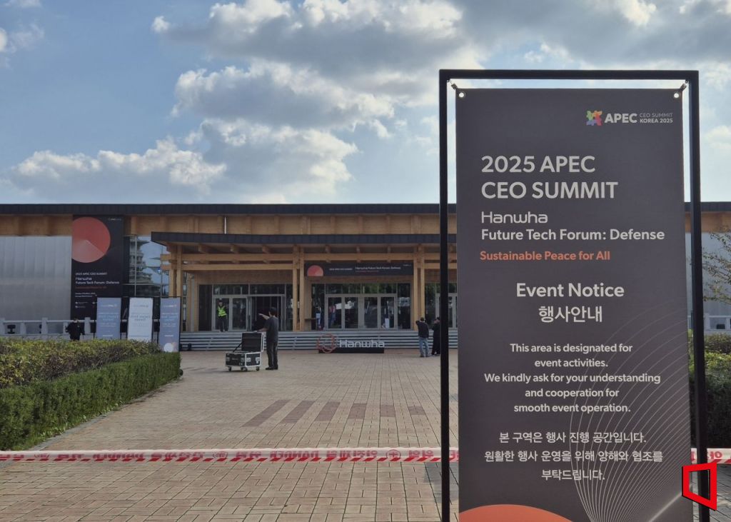 한화가 27일 경북 경주시 국립경주박물관에서 아시아태평양경제협력체(APEC) 최고경영자(CEO) 서밋 2025 퓨처테크포럼-방산'을 개최했다. 사진은 26일 박물관 내에 행사장을 꾸미고 있는 모습. 경주=오지은 기자