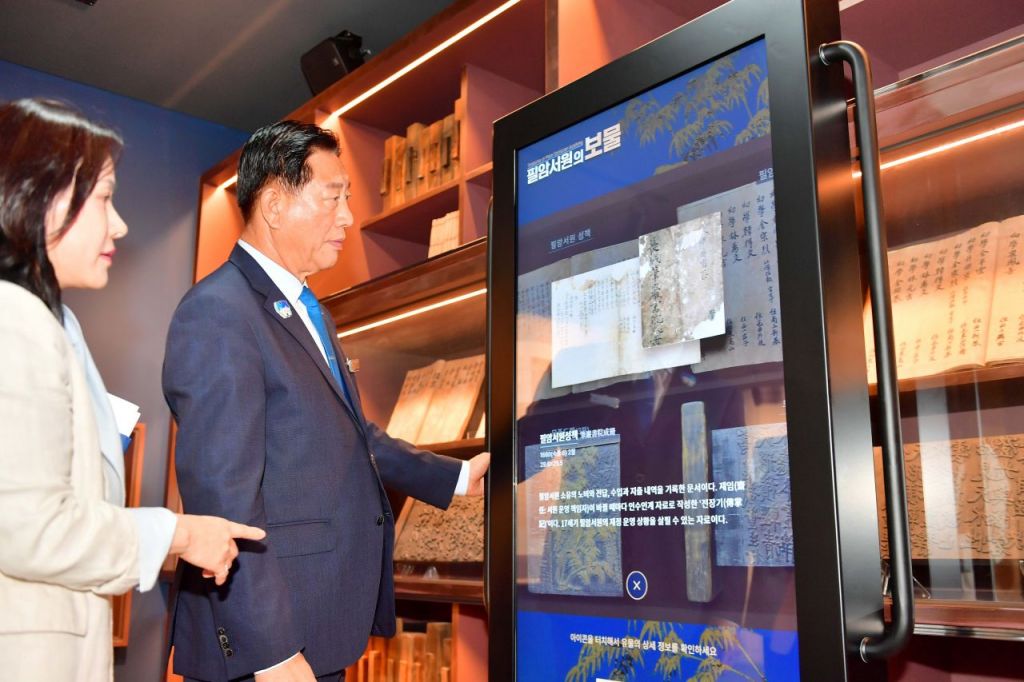 김한종 장성군수가 디지털 전시 공간으로 거듭난 필암서원 유물전시관에서 역사 정보를 확인하고 있다. 장성군 제공