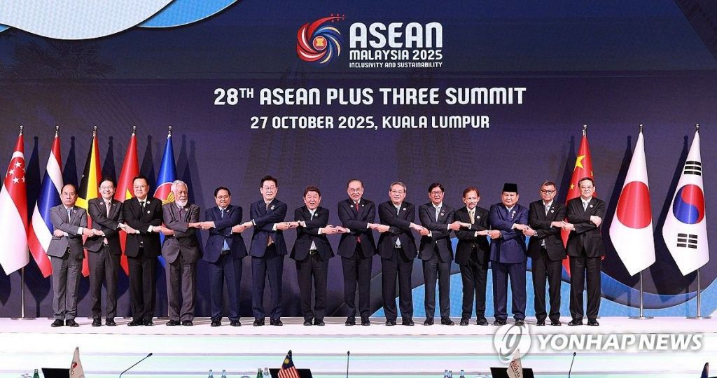 이재명 대통령이 27일 말레이시아 쿠알라룸푸르 컨벤션센터에서 열린 아세안+3 정상회의에서 참석자들과 기념촬영을 하고 있다. 연합뉴스.